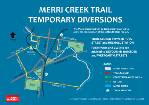 The closure of this section of the Merri Creek Trail is required for works to take place on the Clifton Hill Rail Project. A new rail bridge will be constructed across the Merri Creek (and Merri Creek Trail). The trail needs to be diverted to remove the public interface with the project works and ensure the safety of pedestrians, cyclists and the workforce.